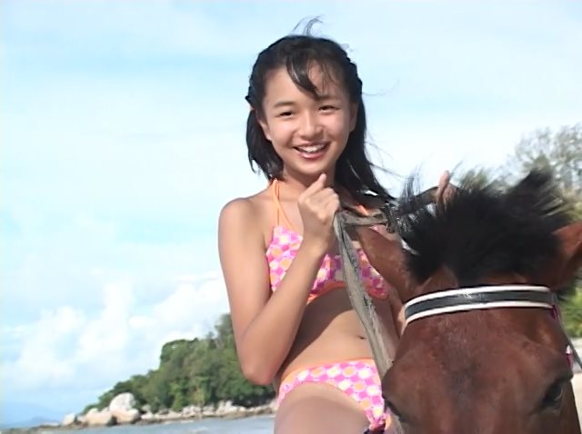 ちょっとサイズが大きいのかな?と思うピンク色のビキニ。かがむシーンとかで膨らみかけの乳房が見えるのだが、一瞬。なぜか馬に乗って登場、なぜかビーチで遊ぶ、なぜかシャワーシーン、という演出が不思議の連続なのだがイメージビデオぽいと言えばぽいかな。